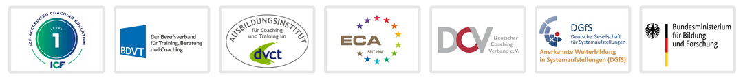 The institute is recognised and certified by the German Association for Coaching and Training (dvct), the European Coaching Association (ECA), the German Coaching Association (DCV*) and the Professional Association for Training, Consulting and Coaching (BDVT):